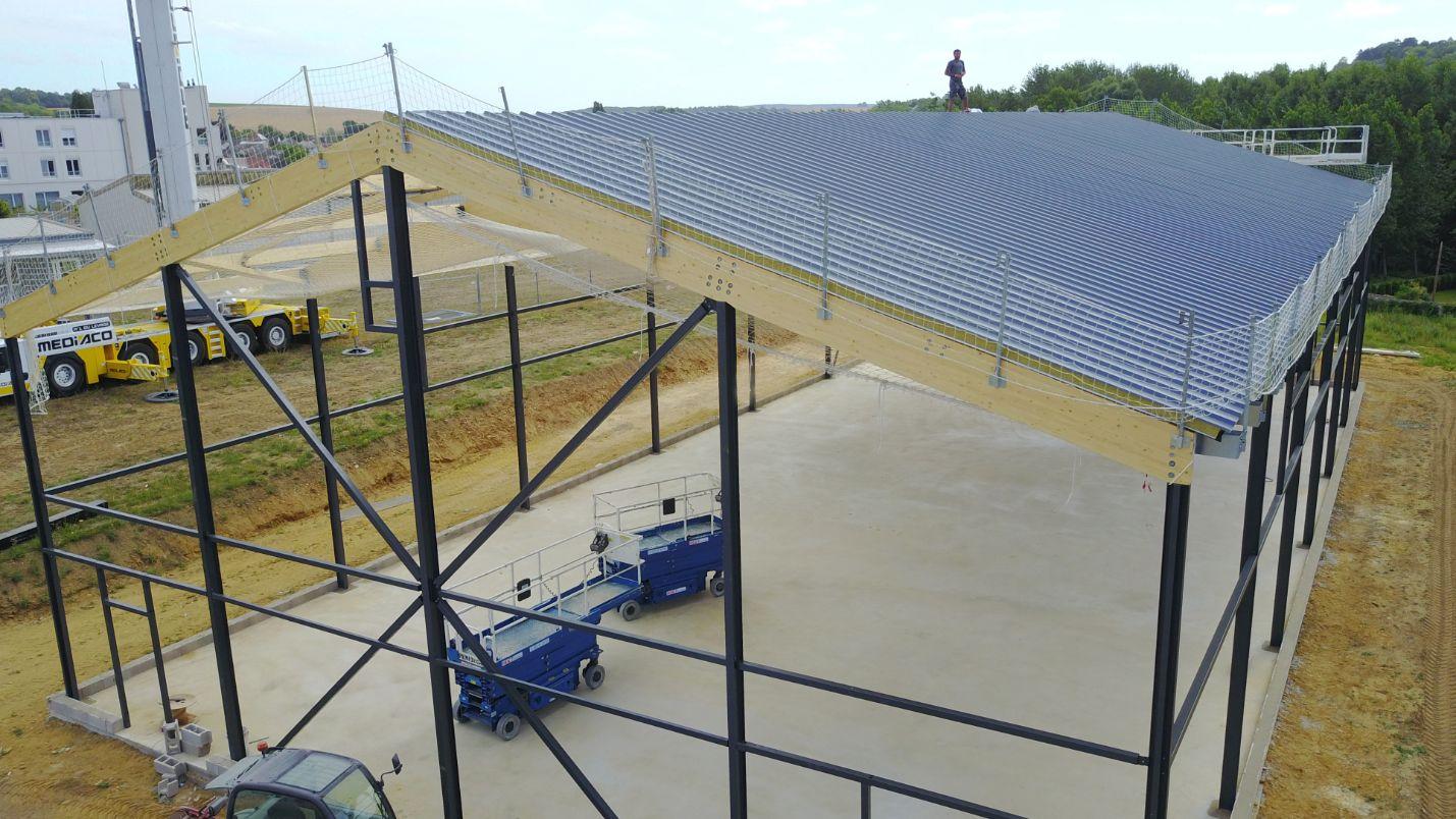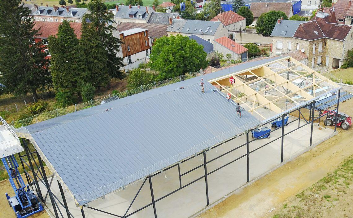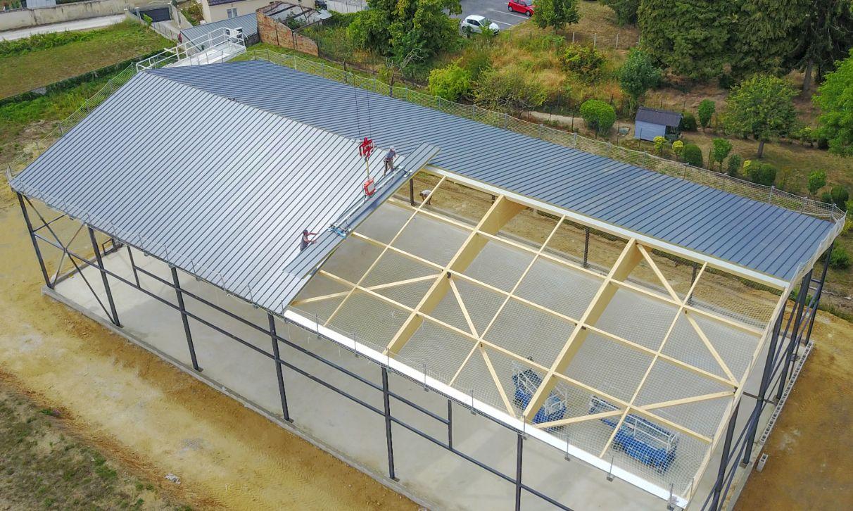 Le bâtiment se compose d'une ossature et bardage métallique. Sa charpente est en bois lamellé collé.